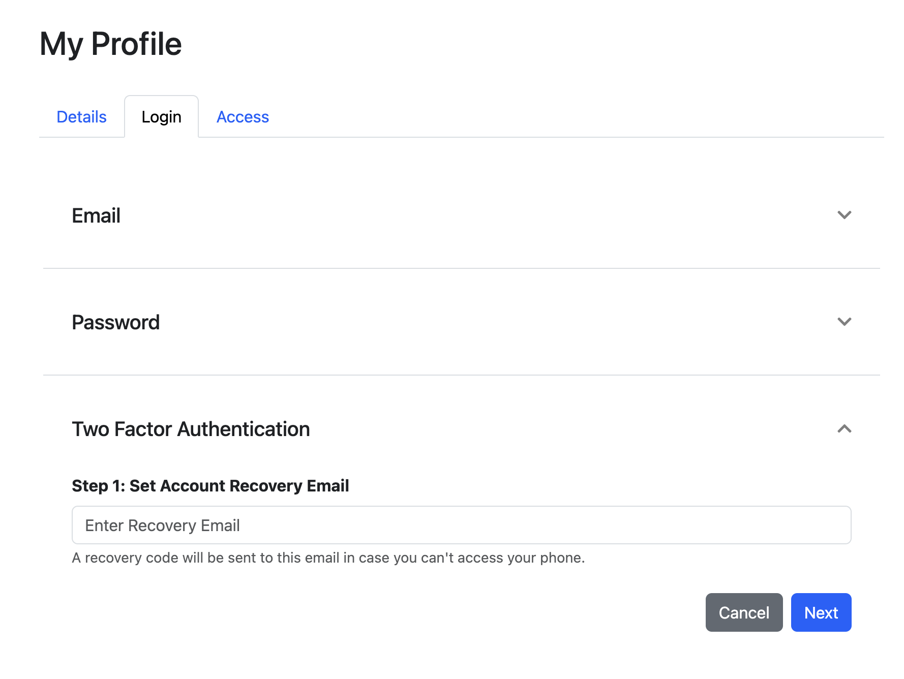 Navigate to Settings Dashboard, select <mark style="color:blue;">**Profile**</mark> on the Side Navigation Menu, and click the <mark style="color:blue;">**Login**</mark> tab.