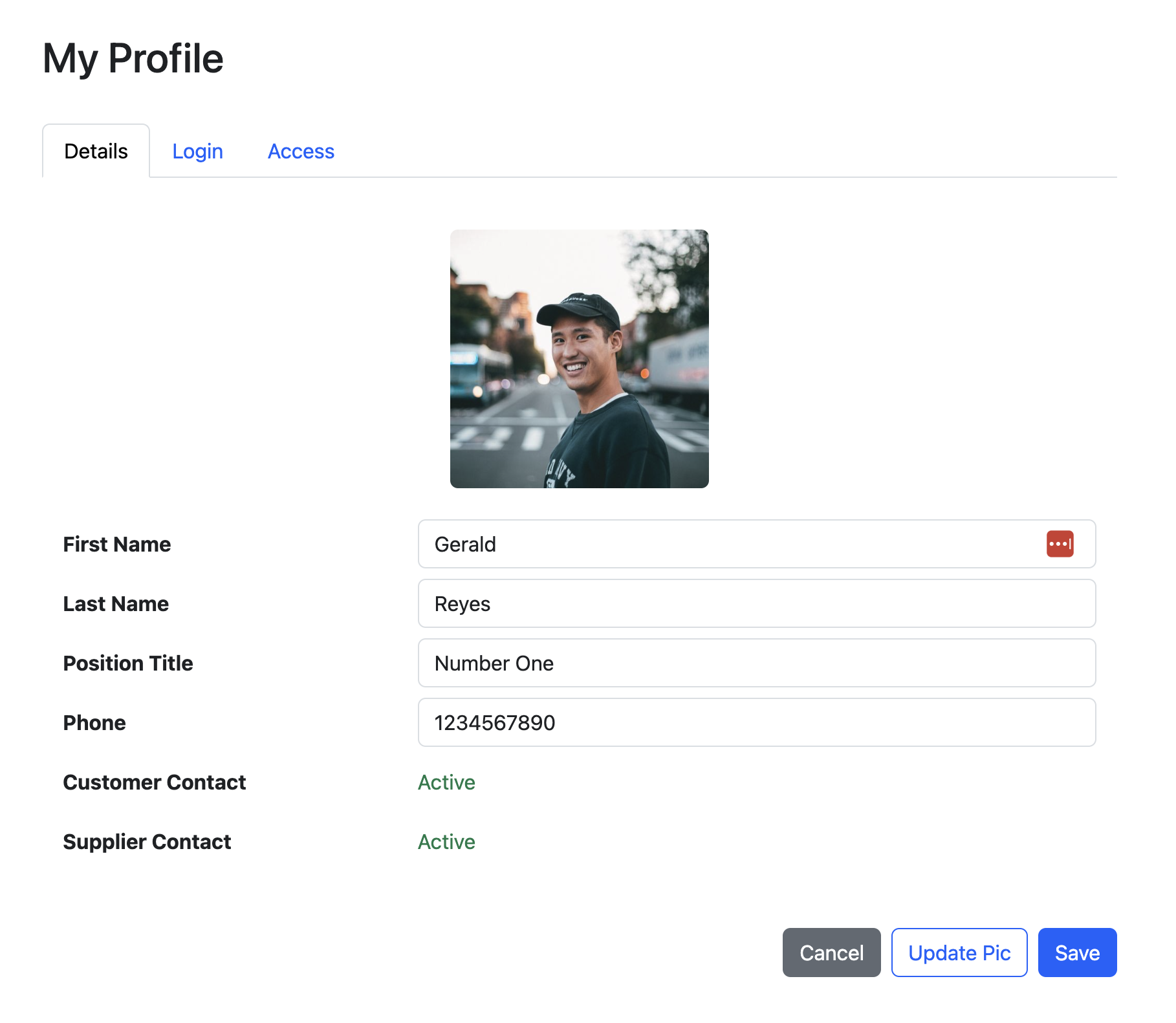 Click the <mark style="color:blue;">**Update Pic**</mark> button to update your profile pic.&#x20;